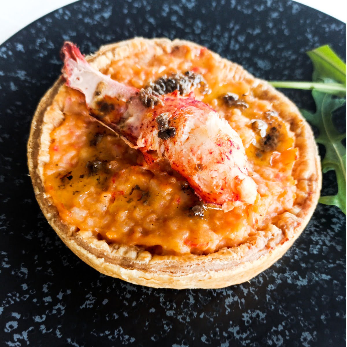 En conjunto, esta tartaleta ofrece una combinación de sabores marinos provenientes de los mariscos y el bogavante, contrastando con la textura crujiente y escamosa del hojaldre. La presentación elegante y los ingredientes de calidad hacen de este plato una opción sofisticada y deliciosa, ideal para aquellos que disfrutan de la cocina gourmet y los sabores del mar.